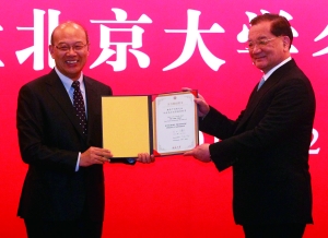 北大校長(zhǎng)王恩哥為連戰(zhàn)頒授名譽(yù)教授證書。