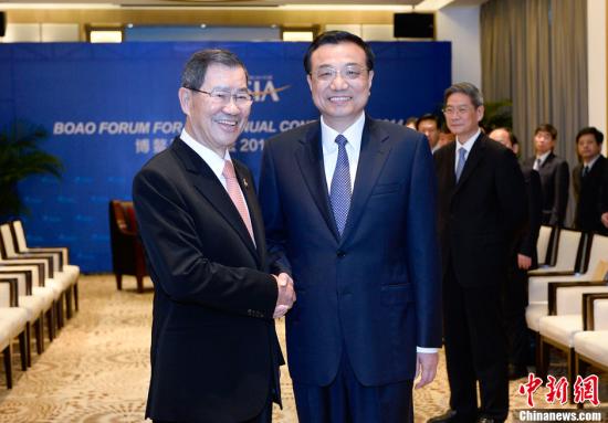 中共中央政治局常委、國務院總理李克強10日下午在海南省博鰲會見了前來出席博鰲亞洲論壇2014年年會的臺灣兩岸共同市場基金會榮譽董事長蕭萬長一行。(來源:中新網 劉震 攝)