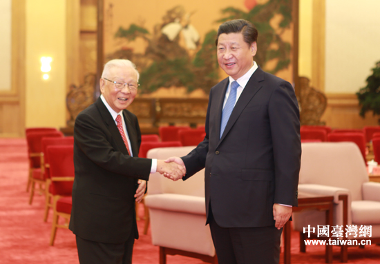 9月26日上午,中共中央總書記習近平在北京人民大會堂會見了由新同盟會會長許歷農(nóng)、新黨主席郁慕明率領的臺灣和平統(tǒng)一團體聯(lián)合參訪團。圖為習近平與郁慕明親切握手。 (中國臺灣網(wǎng) 田云鵬 攝)