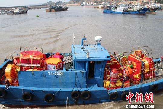 2月16日,今年第十四屆“兩馬同春鬧鬧元宵”活動(dòng)福州馬尾區(qū)贈(zèng)送的35組規(guī)格多樣的花燈在福州連江黃岐碼頭啟運(yùn)往馬祖。 許琳晶 攝
