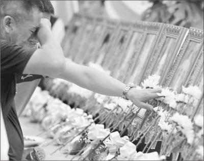 桃園中壢殯儀館,“7·19”游覽車事故大陸遇難者家屬在親人遺像前哀悼。新華社記者 宋振平攝