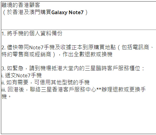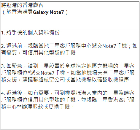 香港三星表示,對于香港民航處最近要求乘客不要于來往香港的航班上攜帶Galaxy Note7,三星電子香港已經采取應對措施,于香港國際機場設立客戶服務柜位,為所有香港及身處香港的Galaxy Note7外國顧客提供緊急協助。所有Galaxy Note7的顧客在登機前,應將手機交予當地的三星客戶服務中心,或當地機場內的三星客戶服務柜位、航空公司或機場保安,并從他們獲取證明文件,在返回原居地后,以便三星協助跟進。
