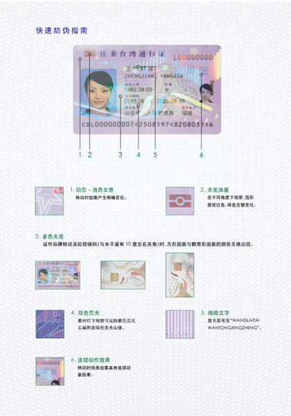 一、新版通行證為參照國際民航組織(ICAO)DOC9303 TD-1標準設計制作的卡式證件,內嵌非接觸式集成電路芯片,采用多項物理防偽和數字安全技術。正面打印持證人個人資料以及證件簽發管理信息,背面打印前往臺灣簽注等信息并可由證件簽發機關重復擦寫。新版通行證不再附發貼紙式簽注。