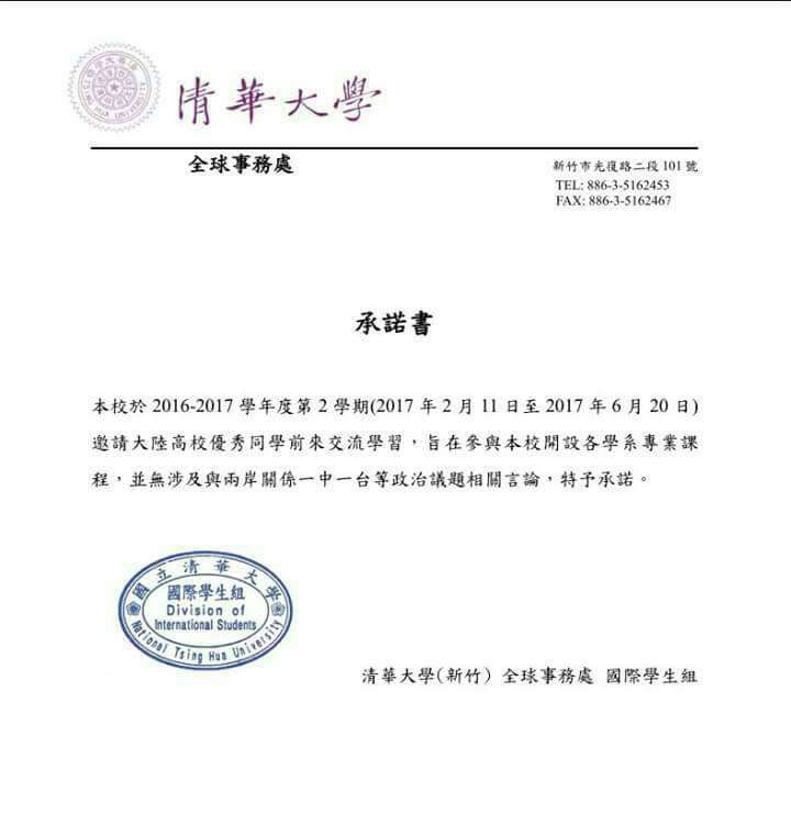 臺灣新竹清華大學與大陸高校簽訂的“一中承諾書”曝光