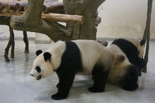 “圓圓”已經出現大熊貓交配的“舉尾”行為,但是“團團”根本不理睬,依舊坐在地上猛吃。(圖片來自臺媒,臺北市立動物園提供)