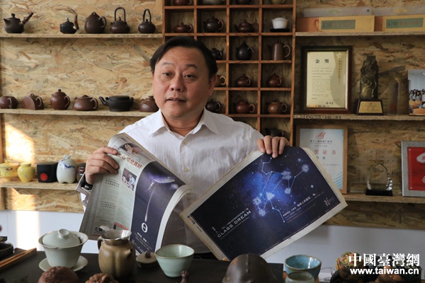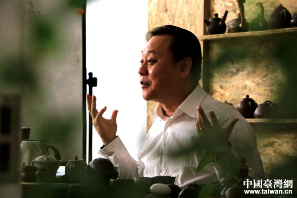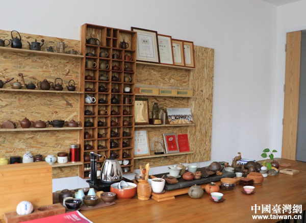 陳炳宏喜歡喝茶,他每到一個地方談成一個項目總要買一把茶壺。在他的會客室中,靠墻的櫥柜上擺著各種各樣的茶壺,每一個茶壺背后都是一個關于創意的精彩故事。(中國臺灣網 張麗媛 攝)