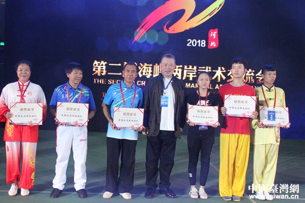 中國臺灣網8月20日石家莊訊 (記者 王莉婷)8月19日上午,“第二界海峽兩岸武術交流會”之“共揚武威”(競賽)環節在河北石家莊舉行了頒獎儀式,河北省臺辦主任王立杰、省臺辦副主任付輝東、臺灣中華全球洪門聯盟總會長劉會進等領導和嘉賓出席并頒獎。