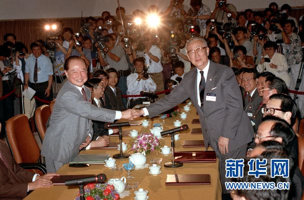 1993年4月27日“汪辜會談”前汪道涵與辜振甫握手。 新華社發