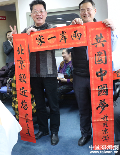 書法家向在京臺(tái)胞贈(zèng)送春聯(lián)。(中國臺(tái)灣網(wǎng) 汪明珠 攝)