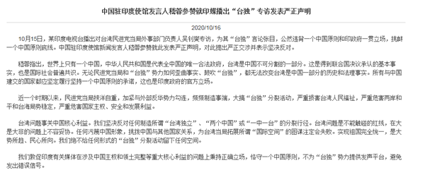 中國駐印度大使館16日就印媒播出“臺獨”專訪發表嚴正聲明。