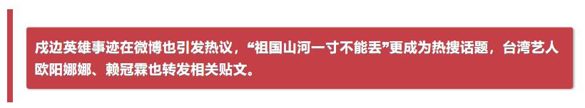 戍邊英雄事跡在微博也引發熱議,“祖國山河一寸不能丟”更成為熱搜話題,臺灣藝人歐陽娜娜、賴冠霖也轉發相關貼文。