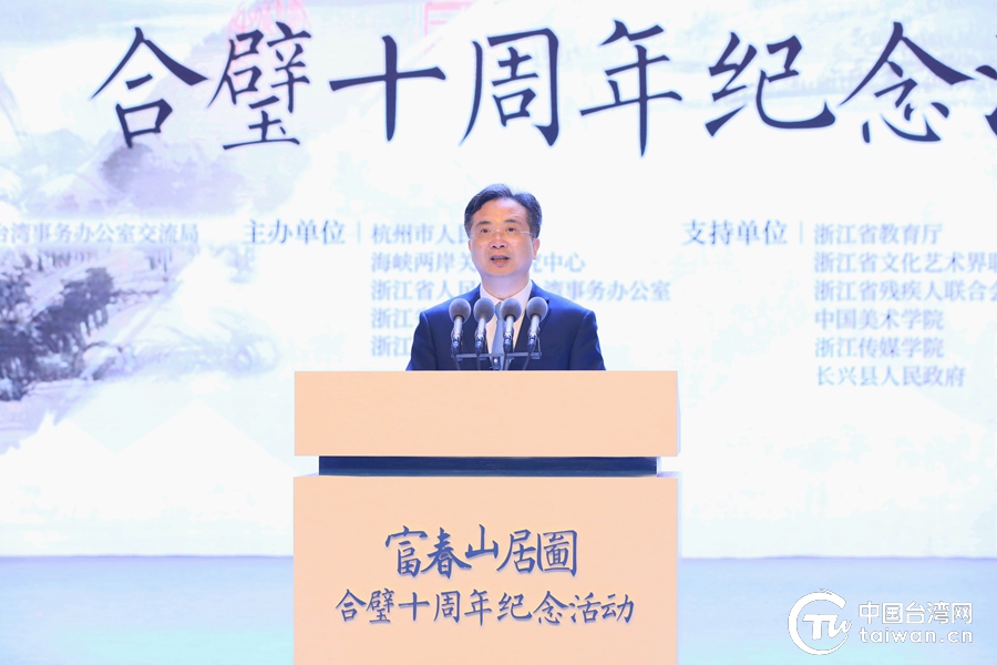 中共中央臺辦、國務(wù)院臺辦主任劉結(jié)一在致辭中表示,《富春山居圖》曾斷離失散數(shù)百年,直到十年前實(shí)現(xiàn)跨越世紀(jì)、跨越海峽的合璧,這段穿越歷史風(fēng)云的傳奇,展現(xiàn)出中華民族文化的深厚偉力,體現(xiàn)出中華兒女對兩岸和平、江山一統(tǒng)、金甌無缺、國泰民安的不懈追求。十年后的今天,浙江省和杭州市舉辦這次系列紀(jì)念活動,重溫中華民族文化瑰寶跨海重逢的歷史時刻,講述寓意深刻的合璧故事,回顧兩岸同胞交流的歷程,其重要意義就在于,強(qiáng)化兩岸同胞特別是年輕臺胞對兩岸同根同源的認(rèn)識,增強(qiáng)文化認(rèn)同、民族認(rèn)同和國家認(rèn)同;鼓舞兩岸同胞增強(qiáng)文化自信,攜手傳承中華優(yōu)秀傳統(tǒng)文化、促進(jìn)兩岸融合發(fā)展;激勵兩岸同胞同心共繪新時代《富春山居圖》,并肩共赴實(shí)現(xiàn)中華民族偉大復(fù)興的新征程。
