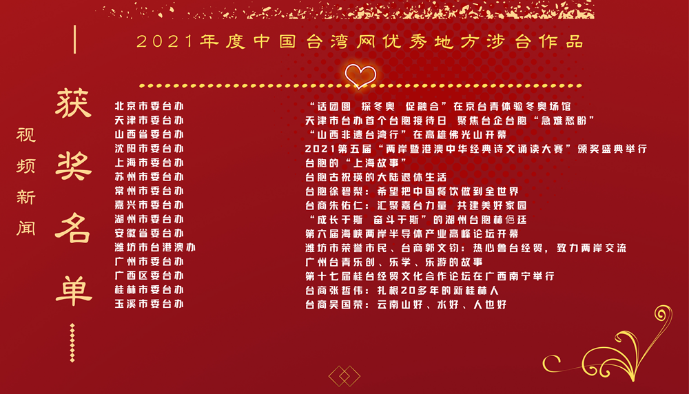 中國臺灣網(wǎng)“2021年度地方涉臺優(yōu)秀作品”揭曉 深化兩岸交流成果匯聚民族復(fù)興力量