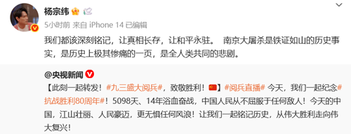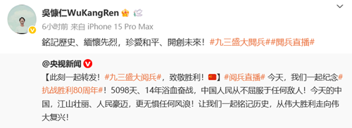 臺(tái)灣網(wǎng)友在相關(guān)內(nèi)容下留言表示,“作為一個(gè)堂堂正正的中國人,今天真的很驕傲”,“身在臺(tái)灣省的中國人,共同紀(jì)念中華民族抗戰(zhàn)勝利,中華民族永遠(yuǎn)昌盛”,“身為臺(tái)灣人,盡管政治體系不同,依然為了中國人民跟中國的強(qiáng)大而驕傲”。