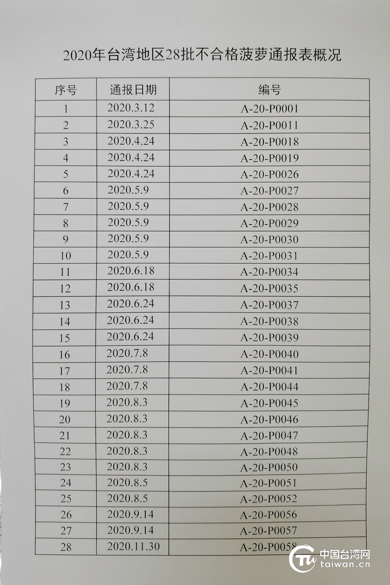 2020年臺(tái)灣地區(qū)28批不合格菠蘿通報(bào)表。(中國(guó)臺(tái)灣網(wǎng) 發(fā))