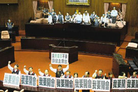 臺灣“立法院”打群架早就聞名全世界,一般上不了國際新聞。這一次干架的規模特別大,連“院長”王金平也掛了彩。幾位民進黨女“立委”以鞋子做暗器,砸中王金平的嘴角。另外有王幸男、蔡啟芳等民進黨“立委”以摩托車大鎖鎖住議場......《詳細》 | | |