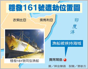 臺當局外事主管部門4月6日表示,臺高雄籍漁船“穩發161號”遭索馬里海盜挾持,船上有兩名臺灣船員和5名大陸船員。