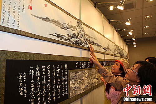 資料圖:3月7日下午,出自大陸名家之手的長(zhǎng)幅剪紙藝術(shù)作品《富春山居圖》(上)、《清明上河圖》,一同亮相張家口蔚縣民俗文化藝術(shù)展,吸引臺(tái)灣民眾駐足欣賞、評(píng)頭品足。中新社發(fā) 董會(huì)峰 攝