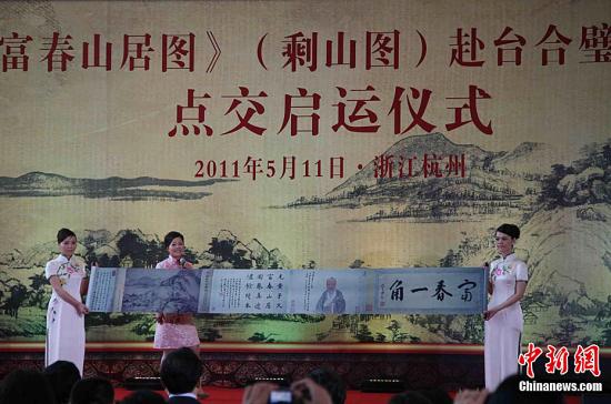 2011年5月11日,珍藏在浙江省博物館《剩山圖》在杭州裝箱、封箱及啟運,途經北京,前往臺北,與《無用師卷》合璧。