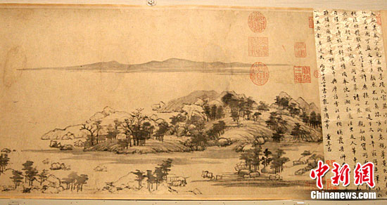 2011年6月1日,被火燒成兩段的《富春山居圖》分隔361年后,在臺北故宮博物院亮相。中新網發 趙振清 攝