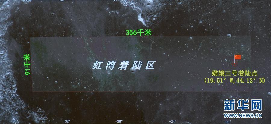 12月14日,嫦娥三號平穩(wěn)落月,中國首次地外天體軟著陸成功。這是北京飛行控制中心大屏幕上顯示的虹灣著陸區(qū)和嫦娥三號著陸點。 新華社記者李鑫 攝