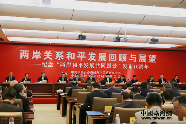 中共中央臺(tái)辦海峽兩岸關(guān)系研究中心與中國(guó)國(guó)民黨國(guó)政研究基金會(huì)共同舉辦、南京大學(xué)臺(tái)灣研究所協(xié)辦的“兩岸和平發(fā)展共同愿景”發(fā)布十周年紀(jì)念活動(dòng)今天在南京舉行。活動(dòng)包括“兩岸和平發(fā)展共同愿景”發(fā)布十周年圖片展和“兩岸關(guān)系和平發(fā)展回顧與展望”學(xué)術(shù)研討會(huì)。中共中央臺(tái)灣工作辦公室主任張志軍、中共江蘇省委書記羅志軍、中國(guó)國(guó)民黨副主席郝龍斌以及國(guó)共兩黨代表、兩岸專家學(xué)者近百人出席。