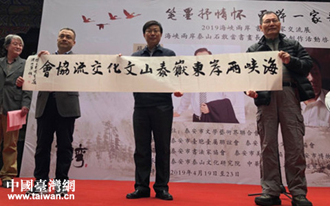 中國臺灣網4月30日泰安訊 4月19日上午,“筆墨抒情懷 兩岸一家親——2019海峽兩岸書畫名家交流展”在岱廟舉行開幕儀式,現場展出了臺灣蔡俊章、泰安劉建東兩位畫家的國畫精品,并啟動了海峽兩岸泰山石敢當書畫長卷2019創作活動。