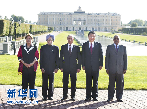 國家主席習近平5日在圣彼得堡出席金磚國家領導人非正式會晤,同巴西總統羅塞夫、俄羅斯總統普京、印度總理辛格、南非總統祖馬就金磚國家合作以及重大國際和地區問題交換意見、協調立場。習近平強調,面對各種風險和挑戰,金磚國家要凝聚在重大問題上的共識,加強團結合作。