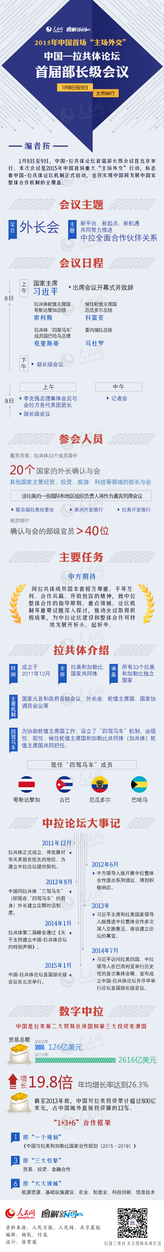 編者按:1月8日至9日,中國-拉共體論壇首屆部長級會議在北京舉行。本次會議是2015年中國首場重大“主場外交”行動,標志著中國-拉共體論壇機制正式啟動,也將實現中國同發展中國家整體合作機制的全覆蓋。