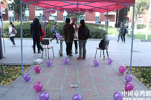 北京師范大學(xué)兩岸四地青年交流協(xié)會(huì)的學(xué)生們?cè)缭绲貋?lái)到體育館外布置攤位,他們?yōu)閮砂端牡厍嗄杲涣魉龅呐Γ缤?yáng)光在這個(gè)寒冷的初冬讓人感到溫暖。
