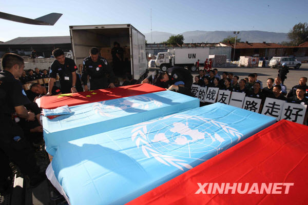 新華網(wǎng)太子港1月17日電 在海地地震中遇難的8名中國維和人員的靈柩17日由中國南方航空公司一架包機(jī)運(yùn)送回國。