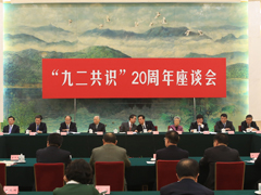 11月26日,中共中央臺辦、國務院臺辦、海峽兩岸關系協會在北京舉辦“九二共識”20周年座談會。中共中央臺辦、國務院臺辦主任王毅強調“九二共識”的核心是堅持一個中國原則,精髓是求同存異,意義在于構建了兩岸關系發展的政治基礎,啟示是要有正視問題、面向未來的政治勇氣和智慧。