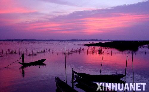 這是海南省海口市東寨港紅樹(shù)林國(guó)家級(jí)自然保護(hù)區(qū)內(nèi)晚霞下的漁舟。