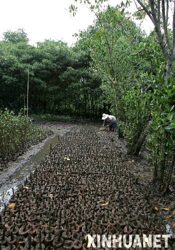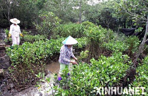 海南省海口市東寨港紅樹(shù)林國(guó)家級(jí)自然保護(hù)區(qū)的工作人員在培育紅樹(shù)林幼苗。 新華社記者丁林?jǐn)z