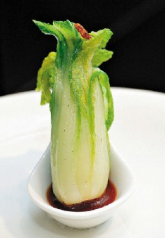 像是游客必看的翠玉白菜,斜倚在小碟子里,主廚蕭廣安選產(chǎn)自臺(tái)灣中部的娃娃菜,整棵菜剝掉90%,只取中心葉菜層、長約8到10公分大小。先經(jīng)過火腿、雞高湯汆燙入味,之后可以淋上XO高湯醬汁熱食、或搭配咸甜的芝麻醬汁當(dāng)開胃冷食,主廚更以櫻花蝦替代螽斯和蝗蟲,食趣十足。