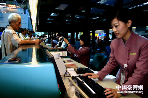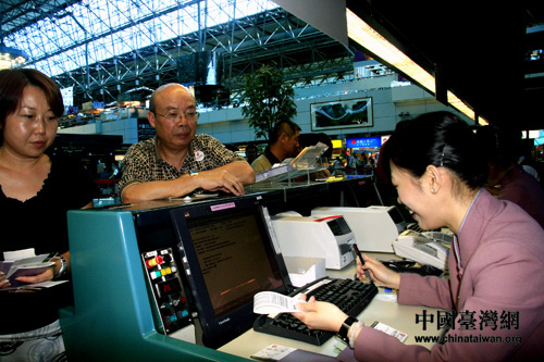 機(jī)場(chǎng)工作人員認(rèn)真熱情地為陸客辦理登機(jī)手續(xù)(攝影:李徽)