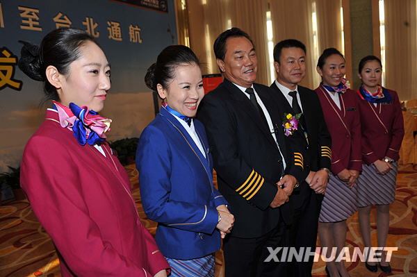 12月10日,南航首次直航臺(tái)北的機(jī)長(zhǎng)劉湘衡(左三)和乘務(wù)長(zhǎng)石菁(左二)率領(lǐng)部分機(jī)組人員出席新聞發(fā)布會(huì)。中國(guó)南方航空公司將于12月18日?qǐng)?zhí)行兩岸直航包機(jī)任務(wù)。南航深圳至臺(tái)北直航包機(jī)為每周兩班,逢周四、周六執(zhí)行。新華社記者壯錦攝