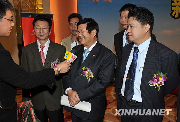 12月10日,即將搭乘直航包機(jī)從深圳飛往臺(tái)北的臺(tái)商葉俊暉(前右二)接受媒體記者采訪(fǎng)。新華社記者壯錦攝 |