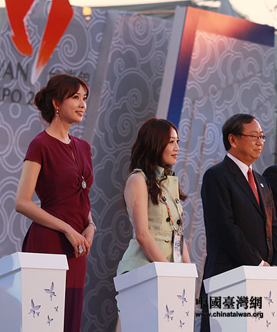 林志玲同另外兩位臺灣館形象代言人一起面對媒體。(中國臺灣網 鐘寶華 攝)