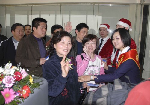 12月25日下午1時許乘客們滿懷喜悅的心情準備搭乘漢臺首航班機赴臺 攝影:嚴越培