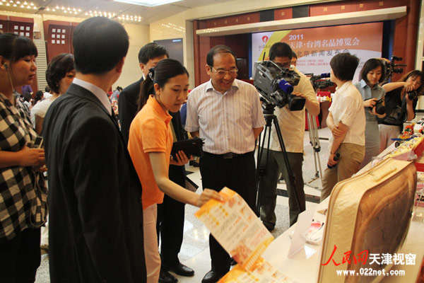 人民網(wǎng)·天津視窗6月14日電:6月13日下午,“2011天津-臺(tái)灣名品博覽會(huì)”在中國貿(mào)促總會(huì)大禮堂召開首次新聞發(fā)布會(huì)。從發(fā)布會(huì)上獲悉,7月7日至10日“2011天津-臺(tái)灣名品博覽會(huì)”將在天津梅江會(huì)展中心舉行。會(huì)上,天津市人民政府副秘書長李培生臺(tái)北世界貿(mào)易中心副總經(jīng)理黃文榮分別代表主辦單位介紹展會(huì)特色及最新展覽訊息。此外,現(xiàn)場還提前展示了多項(xiàng)亮點(diǎn)產(chǎn)品。