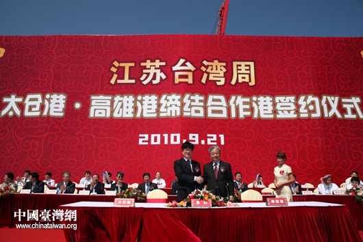 中國臺灣網9月21日太倉消息 9月21日,江蘇太倉港與高雄港締結合作港簽約儀式在太倉港集裝箱碼頭舉行。標志著太倉港與臺灣經濟領域的合作進一步加強。(記者 鐘寶華)