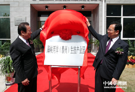 9月19日,在江蘇省泰州市“中國醫藥城”內,臺灣工業總會理事長陳武雄(左)同泰州市委書記張雷共同為“海峽兩岸(泰州)生技產業園”開園揭牌。(中國臺灣網 鐘寶華 攝)