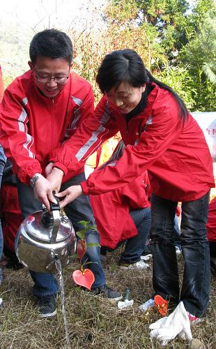 1月13日,一對(duì)新人在阿里山為剛種下的“喜愿樹(shù)”澆水。新華社記者王妍攝