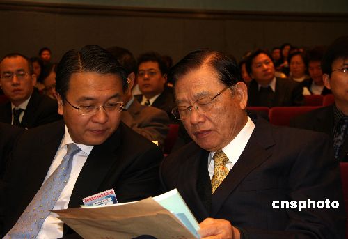 1月15日,兩岸經(jīng)貿(mào)合作與交流研討會(huì)在臺(tái)北舉行。圖為海峽交流基金會(huì)董事長(zhǎng)江丙坤與大陸海峽兩岸經(jīng)貿(mào)文化交流協(xié)會(huì)副會(huì)長(zhǎng)唐煒(左一)在研討會(huì)上交流。中新社發(fā) 陳立宇 攝