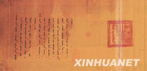 這是順治十四年(公元1657年)順治皇帝派人慰問五世達(dá)賴?yán)飼r(shí)頒發(fā)的敕諭。 新華社發(fā) 組圖:歷史檔案證明:歷世達(dá)賴?yán)锒冀?jīng)中央政府認(rèn)定、冊封