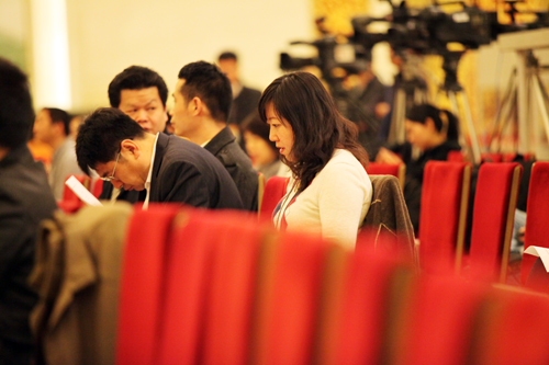 政協記者會開始,一位身穿紅衣的女記者雙腿跪地搶拍。(南南、劉洋、張魏波攝影報道)