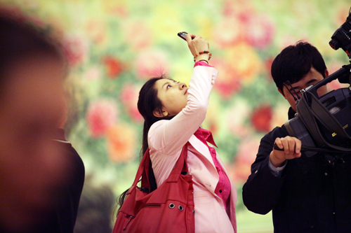 在政協記者會前,北京電視臺的女記者用手機拍下金色大廳發到微博上。