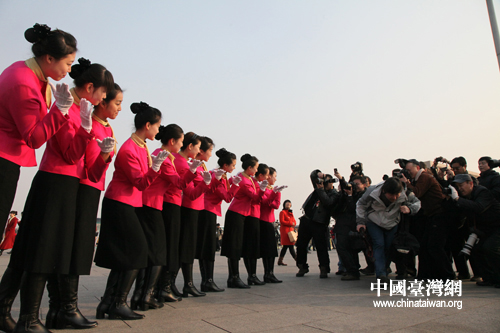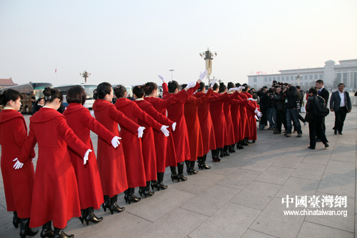 3月5日,十一屆人大四次會(huì)議在人民大會(huì)堂開幕。天安門廣場(chǎng)大會(huì)工作人員受到了記者的關(guān)注。各種造型的女服務(wù)員讓攝影記者不停地按下手中的快門。肖春陽、劉洋攝影報(bào)道