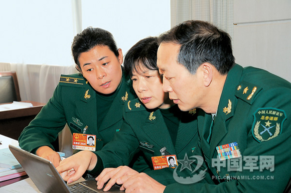 3月8日,曾屢奪軍事五項團體冠軍、5次打破世界紀錄的徐蕾代表(左一),就小組討論中的熱點話題與裘山山代表(中)、冉崇偉代表在一起交流。本報記者 馮凱旋攝